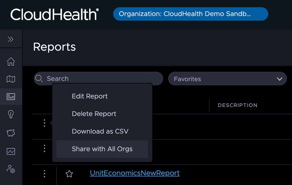 CloudHealth is now announcing the sharing of public reports from the Top level organizational unit to all sub organizations through an action on reports. If a report is public, it can be shared with all Sub organizations. To share with all orgs, click the three dots next to the report name and click “Share with All Orgs” and to unshare, then click on “Unshare from All Orgs”.