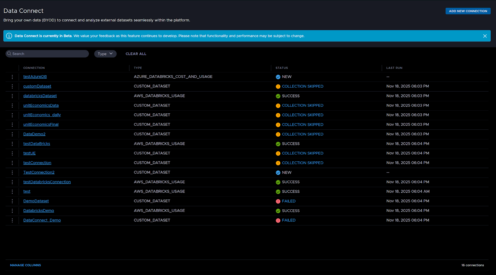 CloudHealth is excited to announce the Public Beta of Data Connect as part of the new experience. The capability is launched with two key offerings: Custom File Upload and an Automated Out-of-the-Box (OOTB) Connector for Databricks. To access the Data Connect (Beta) feature, navigate to CloudHealth New Experience > Setup & Configuration > Data Connect (Beta).