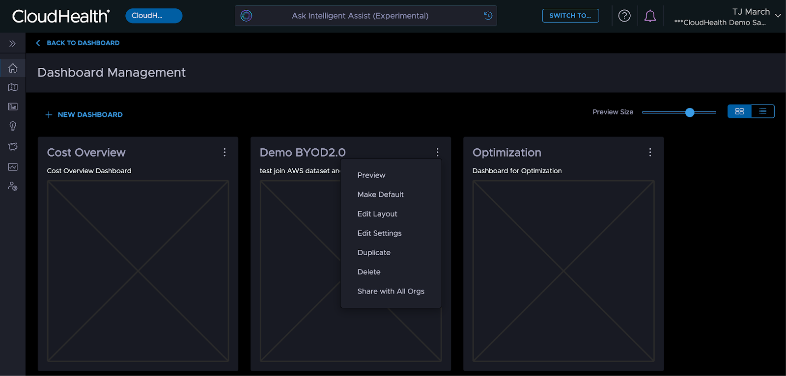 In the new CloudHealth experience, customers can embed Custom reports alongside our out of the box widgets on the same dashboard. These dashboards are now shareable across SubOu boundaries and shareable tenant wide. To access the sharing functionality, navigate to the manage dashboards page, click the menu options next to the dashboard you want to share, and click “Share with Sub Organizations."
