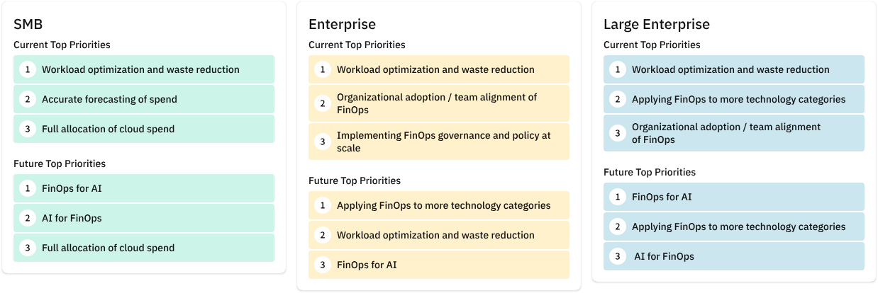 Sanjna: I really like that the organizational priorities reflect reality, right? Day-to-day, what is it that FinOps practitioners care about? It is the same base reduction, making sure we're clean, optimizations done, allocations done. But since I'm sure everyone's manager is kind of asking them to say, "Hey, what is this whole AI stuff? Can we get in on it?" that's why people are kind of investigating it. Unless you have significant costs in AI, it's not something you will spend your everyday on. It is something that you want to dabble in, kind of like what FOCUS was two years ago. It was the big new thing, everyone wants in, but no one really knows how or why it's valuable to you. I feel like that's kind of the hype cycle we might be in, so everyone kind of expects that we will make this a top priority in the future, but today our bread and butter seems to be allocation and forecasting and good old optimization and idle waste.