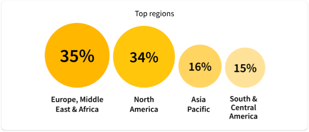 Looking at the regions, Europe and EMEA took over the mantle of leaders from North America. Last year, EMEA was 26%, now it's 35%. North America was 42%, now down to 34%. So, certainly, EMEA is beginning to overtake North America in response to this survey. Asia also pipped South and Central America, going from 10% to 15%. Shout out to everybody who's not in North America.