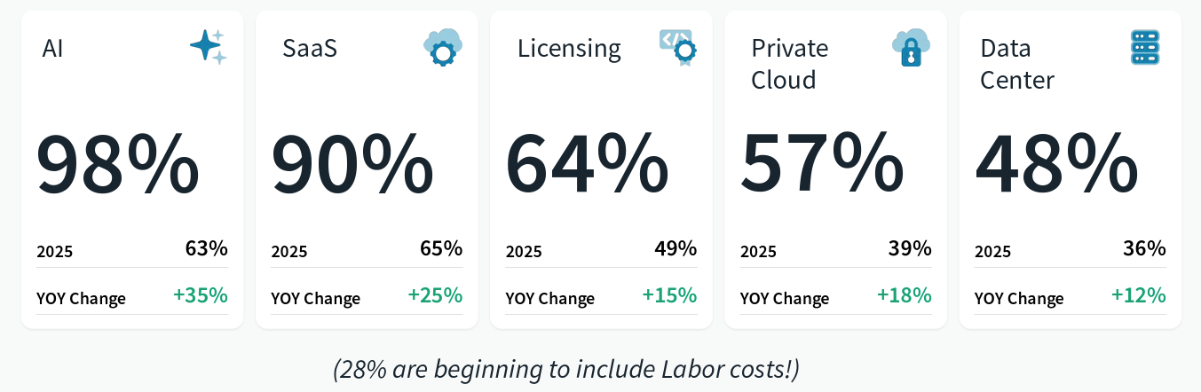 Sanjna: Does anyone else think it's surprising that AI, while AI might be the same as licensing or SaaS, depending on how you're using AI in your company, or data center too, does anyone find it interesting that it is standing as its own pillar? Because most of us consume AI basically in any of these other formats that are also listed on this page. But it is standing on its own with a really huge number behind it. Do we think it's interesting? Do we also consume AI separately? Are we tracking those costs separately? Or are we consuming them as a part of SaaS license or public cloud costs?