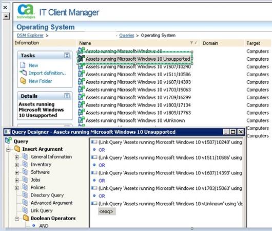 To identify Win10 assets requiring upgrade recommend query or in this case a set of linked queries to ID the unsupported Win10 versions. Dynamic group based on previous query and structure in place for deployment via SD or SD policy. Example query.
