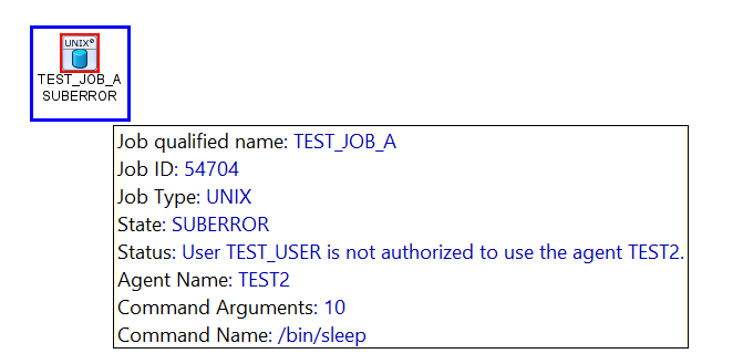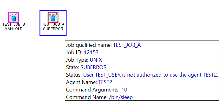 A UNIX job originally configured in define to run on TEST1 was manually triggered and changed to run on TEST2, an agent for which the user has no AGENT or AGENTUSER permissions.