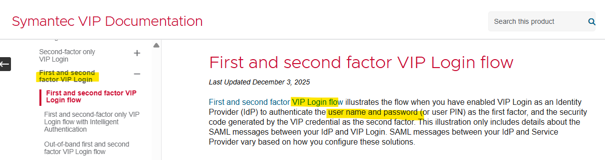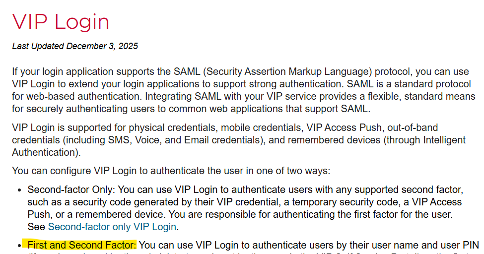 - where "VIP(Saas) Login SAML Idp only work on VIP username & VIP Pin and does not support LDAP auth" it should be listed in VIP Techdoc as limitation(If Product team does not have plan to enhance).