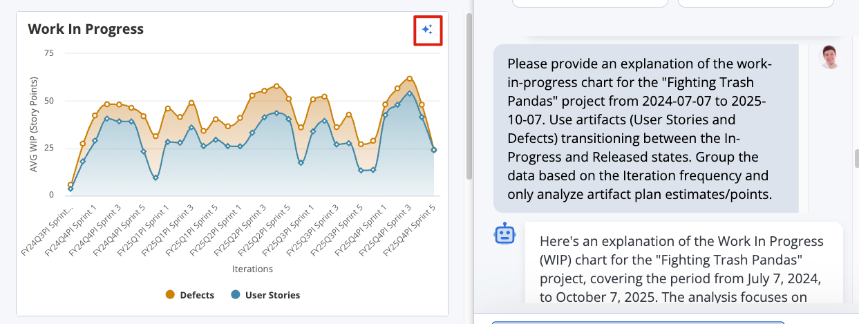Click the AI button on the throughput/velocity or WIP chart on the Team Board > Charts > Flow Metrics to get chart interpretation in the AI chat bot.
