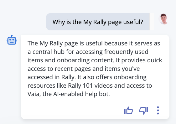 Rally is pleased to introduce the new AI Chat bot - your AI-powered workspace assistant that helps you get answers, insights, and create content with more context using your data.