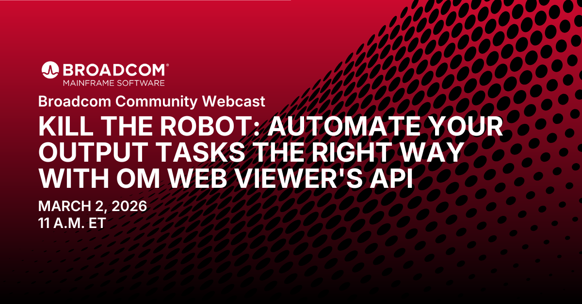 Join us on March 2, 2026, at 11 a.m. ET for this webcast. During this session, you’ll see how to replace repetitive Web Viewer clicks with real automation using Zowe CLI and supported APIs. We’ll demo practical workflows, such as automatically pulling five daily reports, assembling a weekly package, and emailing it to your manager—without babysitting the process.