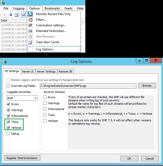 1. Open "Altiris Log Viewer" on Symantec Management Platform machine and enable "Trace", "Verbose" logging.