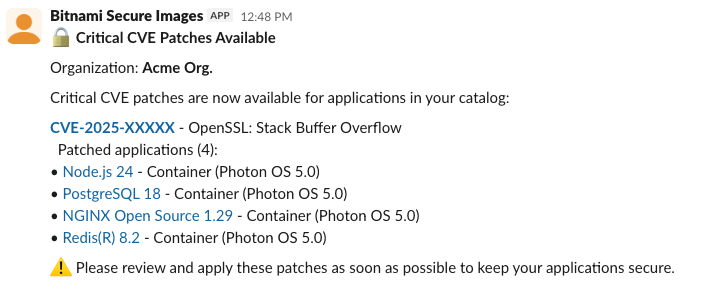 Bitnami Secure Images Notification Providers are more than just alerts; they are an automation tool for your entire software supply chain. By bringing critical information (operational, lifecycle, and security) to your fingertips, we help you maintain a healthy, up-to-date, and efficient software catalog.