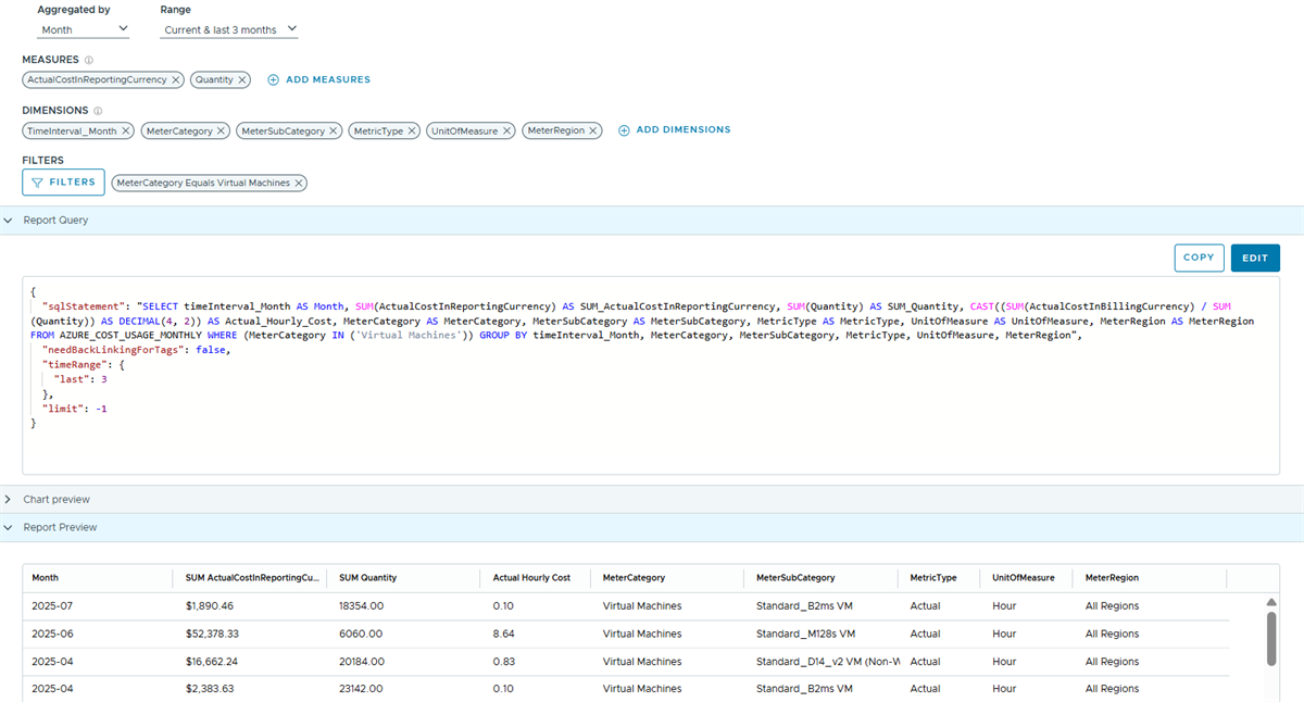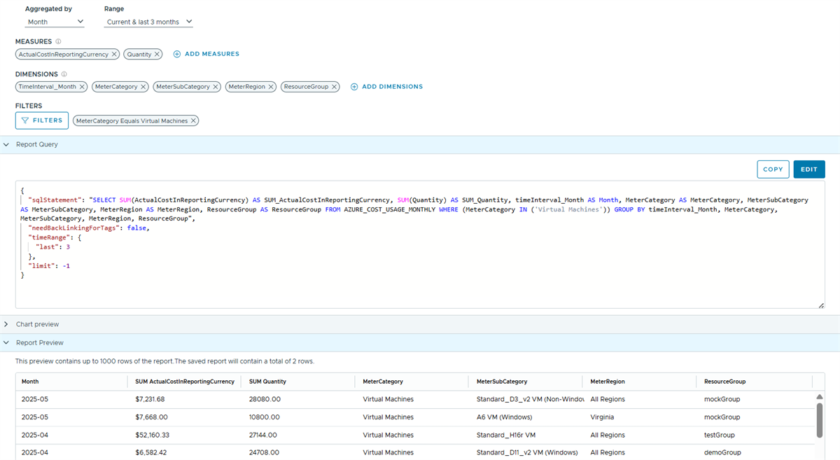 The following configuration would create a simple Azure Virtual Machines report that contains cost and usage information as well as some specifics about the virtual machines. It is only created by using the UI editor.