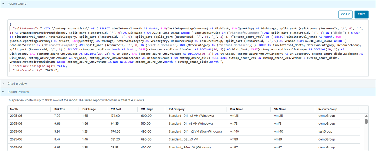 This FlexReport shows Azure Virtual Machines and their associated Disks. Temporary tables allow you to synthesize your own datasets or merge different data to create your report. The report shows Virtual Machine and associated Disk Cost and Usage and provides additional data about the assets.