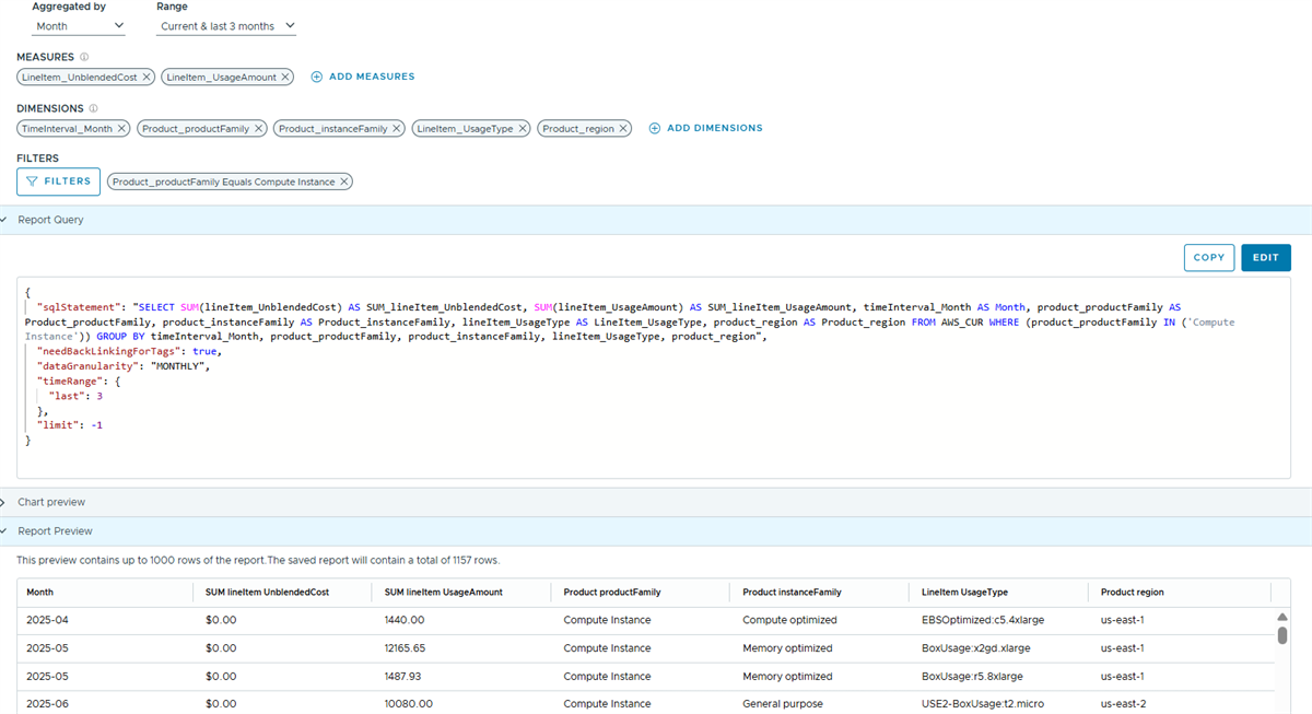 Similar to the Azure Virtual Machines report, we are able to create a report but for AWS EC2 Instance Cost and Usage simply using the UI.