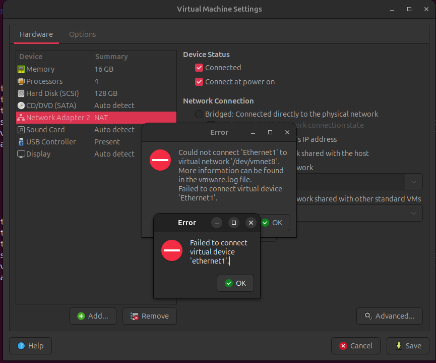 Error toggling removable device: Failed to connect virtual device 'ethernet1'.