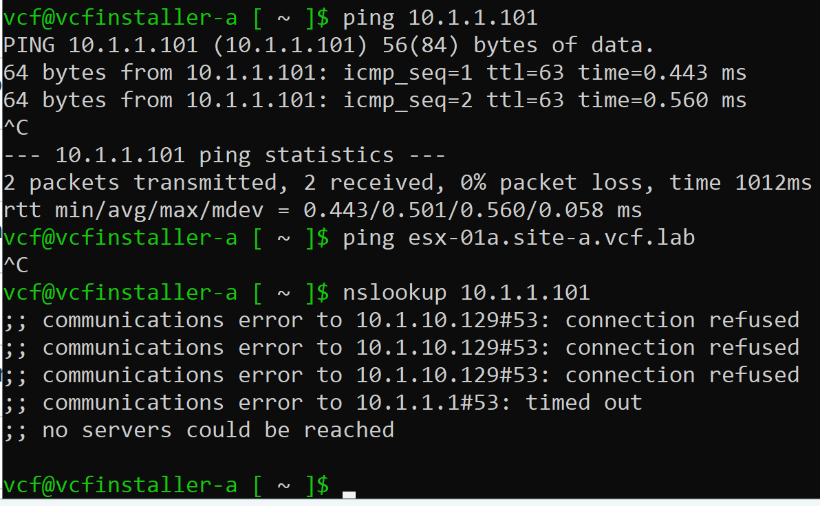 Can you run nslookup esx-01a.site-a.vcf.lab from vcf installer and see if you still get connection refused?