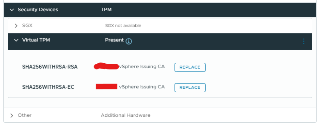 This image shows what the VM looks like after the Remove-VTpm cmdlet was ran against it. It used to have a large string printed there instead of "[CompanyName] vSphere Issuing CA".