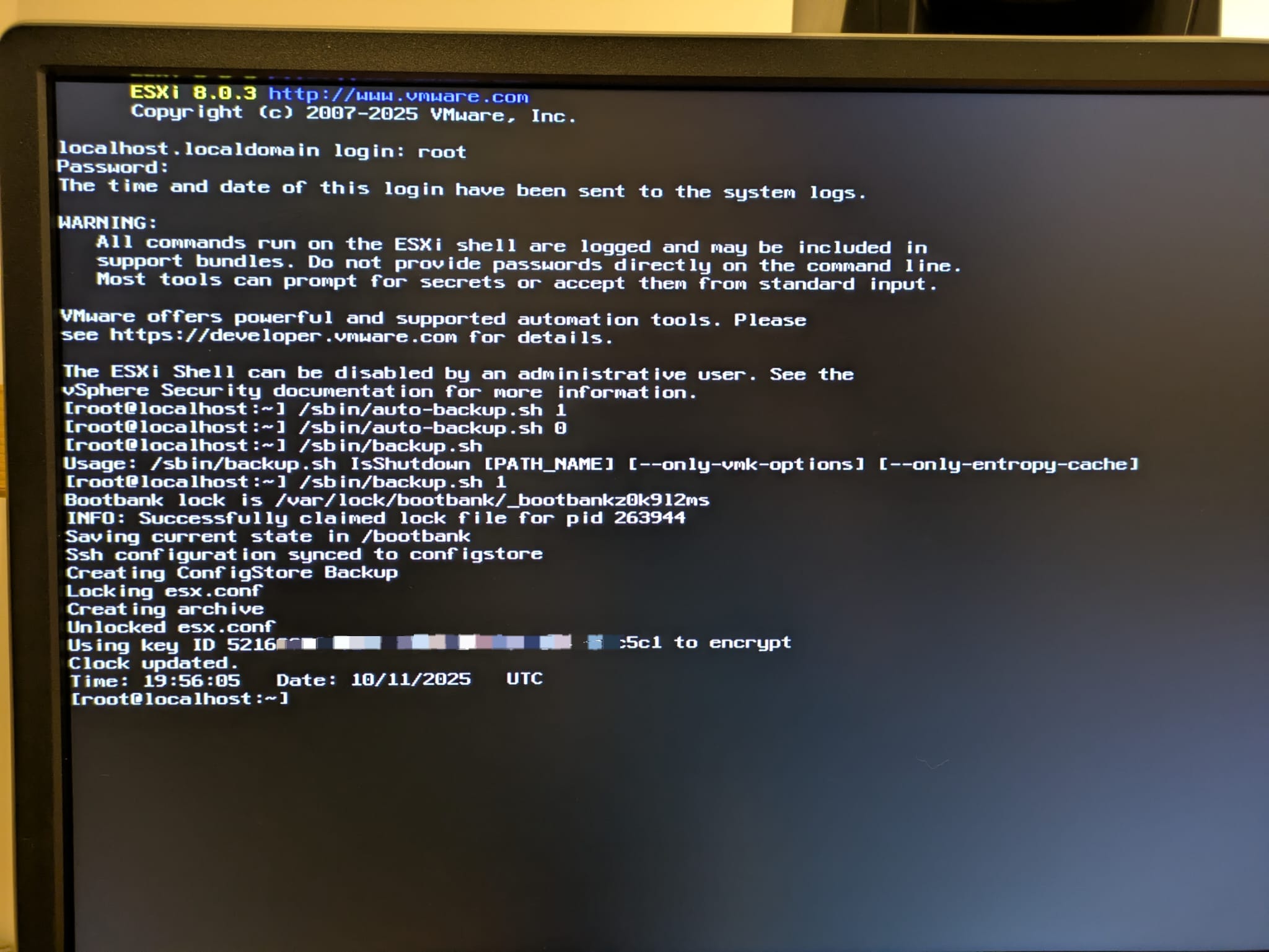 I installed the harddrive back into my old system, retrieved the encryptionrecoverykey and booted with "shift+o" and ESXi seemed to boot up again. I entered the shell and tried both "/sbin/backup.sh 1" and "/sbin/auto-backup.sh 1" and although the output looks fine: