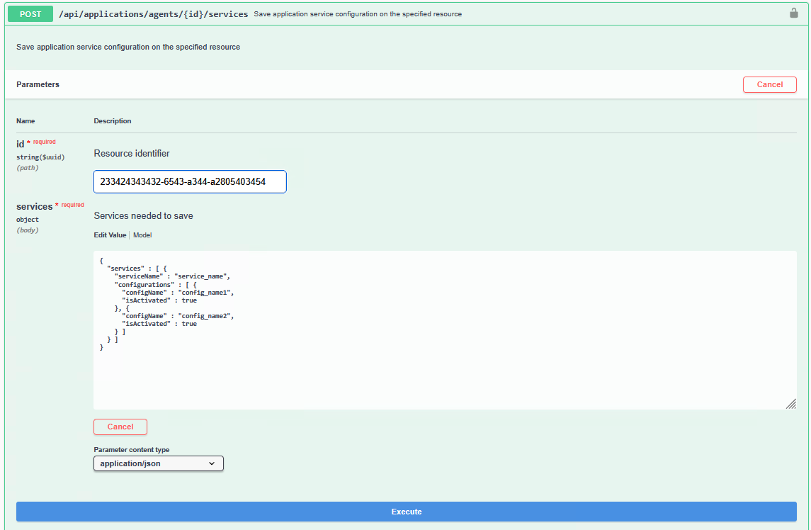 Fill in the Resource Identifier of the target vm and replace the services code (Services needed to save) with the modified json output in Visual Studio Code.